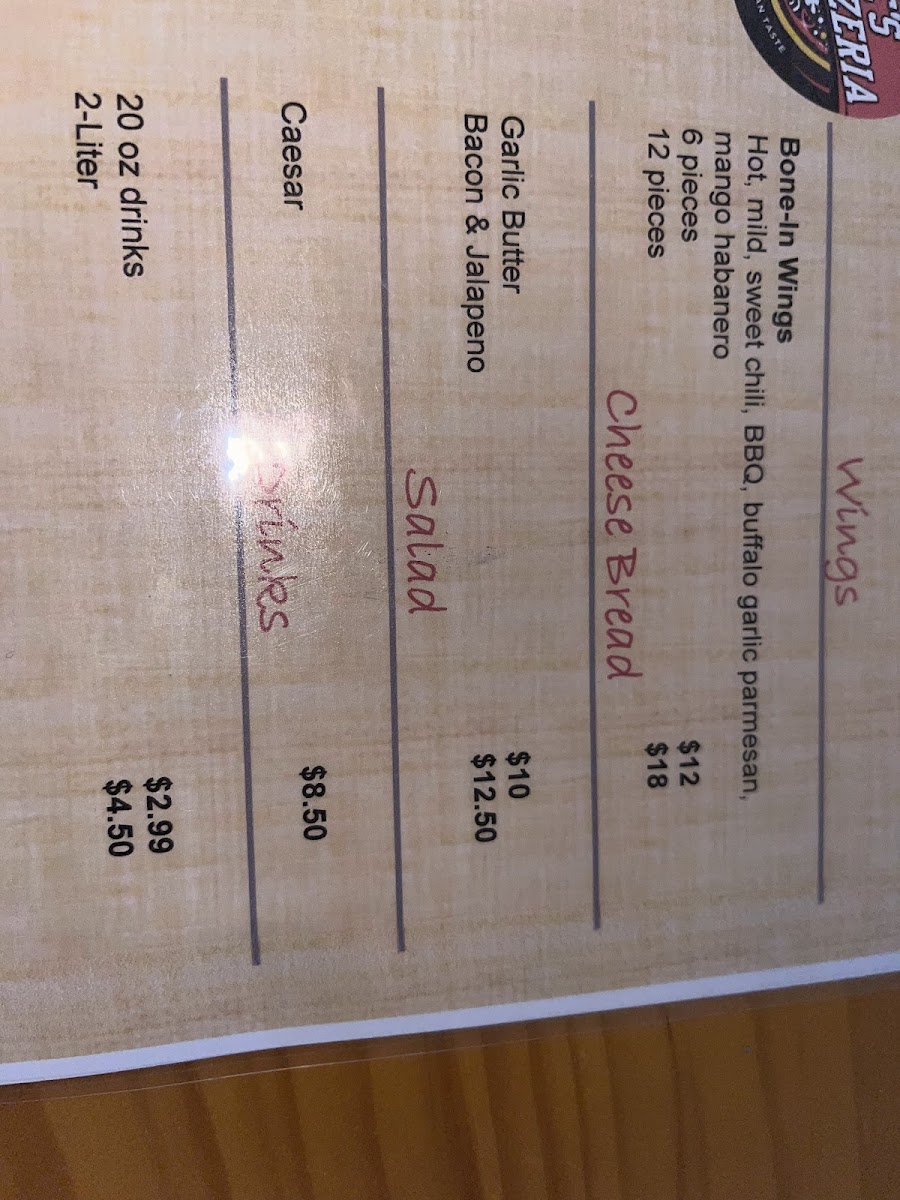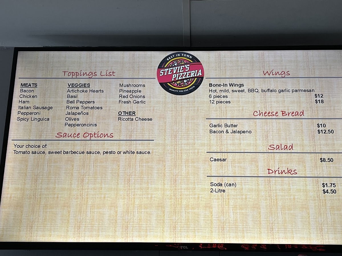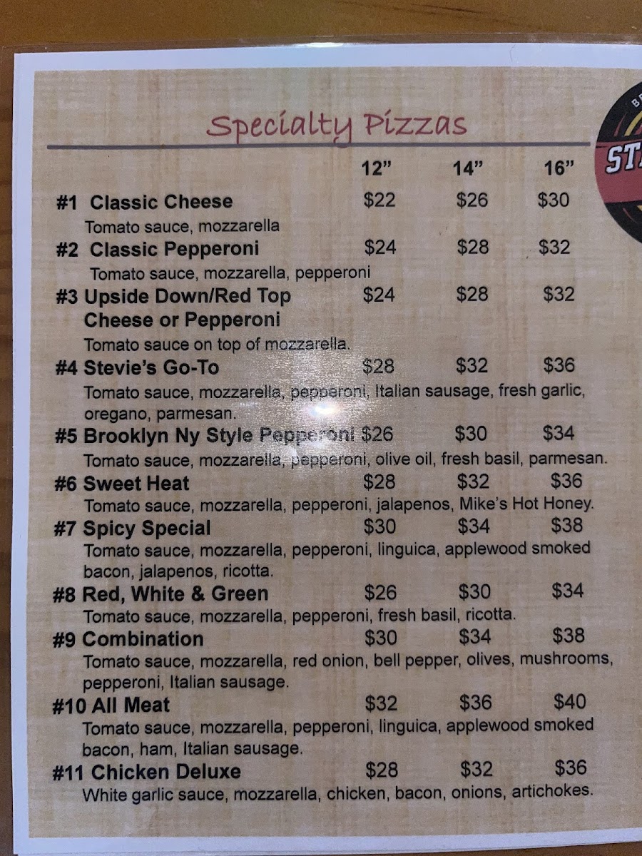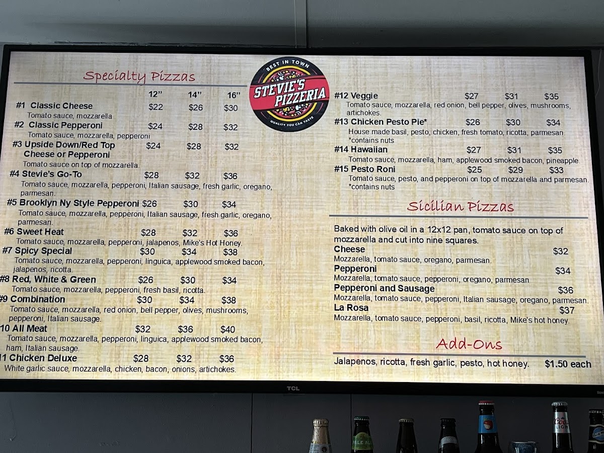 Stevie's Pizzeria offers a delightful array of options that are sure to satisfy a variety of cravings. The specialty pizzas include favorites like the Veggie for $12, the hearty All Meat for $10, and the flavorful Pesto Roni for $15. If you're looking for something more classic, the Stevie's Go-To and Classic Pepperoni are available for $4 and $2, respectively. For a unique twist, their Sicilian square pizzas come in options like Cheese, Pepperoni and Sausage, and the standout PepperoniLa Rosa. The restaurant also serves a variety of condiments to complement your meal, including Pesto, Ranch, and Hot Honey. For appetizers, Bone-In Wings are a great choice, offering a savory start to your meal. You can also enjoy Garlic Butter Cheese Sticks, available in Cheese or the extra indulgent Cheese Bacon & Jalapeño variety. To wash it all down, they offer 2-Liter and 20 Oz Bottled Drinks. With its diverse menu, Stevie's Pizzeria is perfect for a casual meal with family or friends, offering something for every taste.