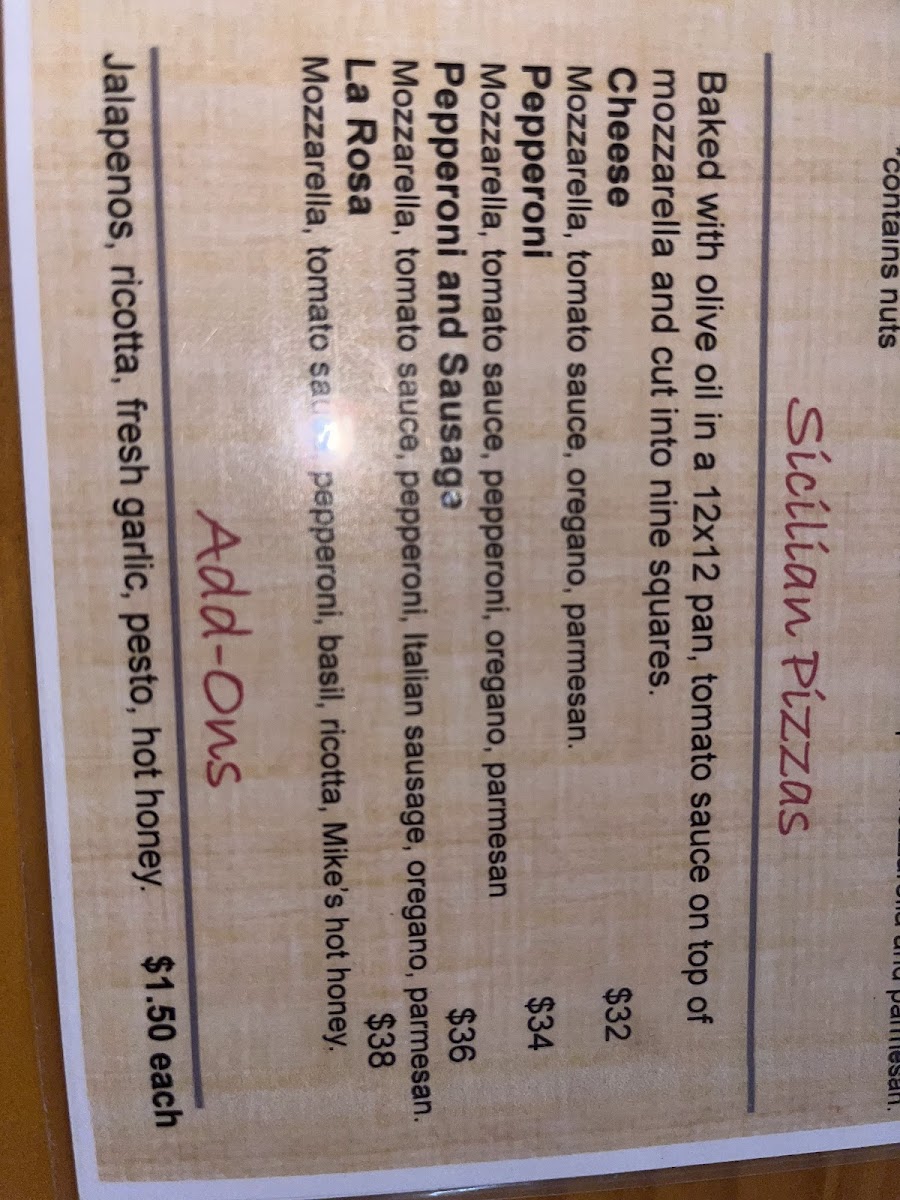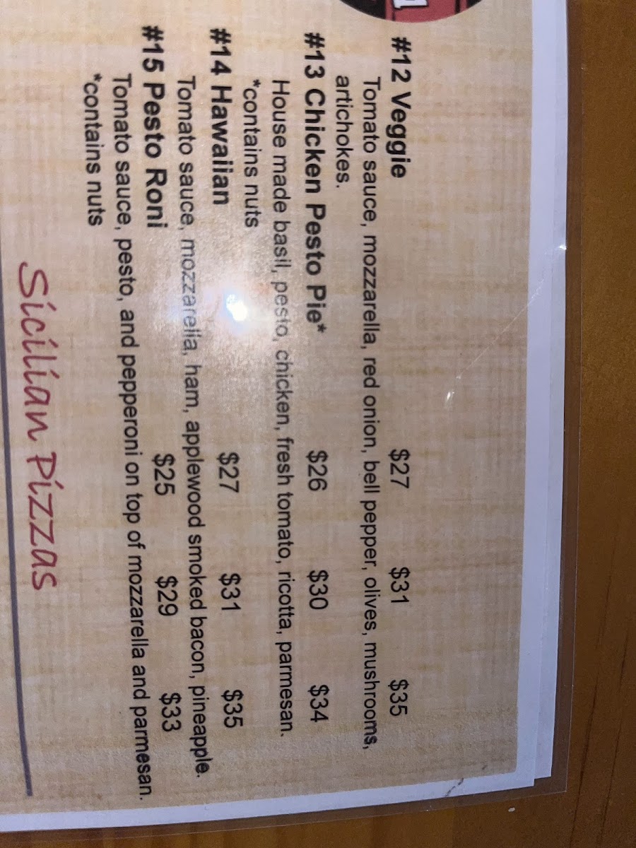 Contains nuts. Tomato sauce, pesto, and pepperoni on top of mozzarella and Parmesan.